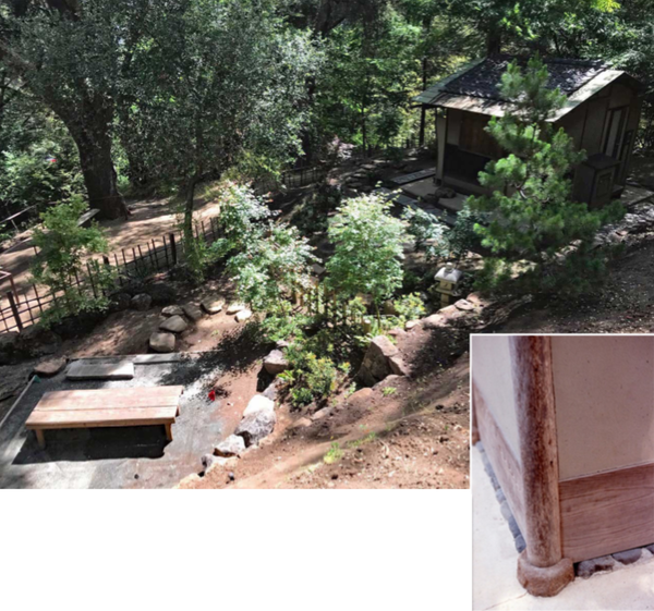 At the end of May, Kezurou-kai USA was asked by Hakone Foundation to provide a schedule for the possible work, and to provide logistical and expert assistance to design and build the machiai structure. John Larissou knew of the old Rikyu-style waiting pavilion which is the basis for many similar scaled pavilions across Japan. So we’ve undertaken a few changes in the design to help link it to the style of the Kakudo Teahouse built in 1946. John is a craftsman himself and will fabricate the copper roof shingles and eventually complete the roofing for the machiai.