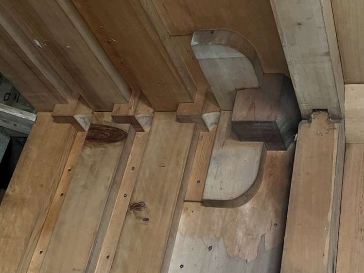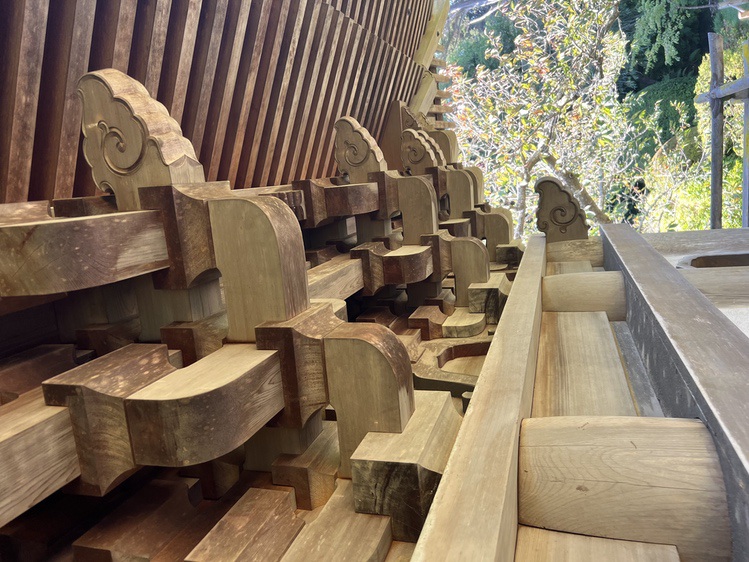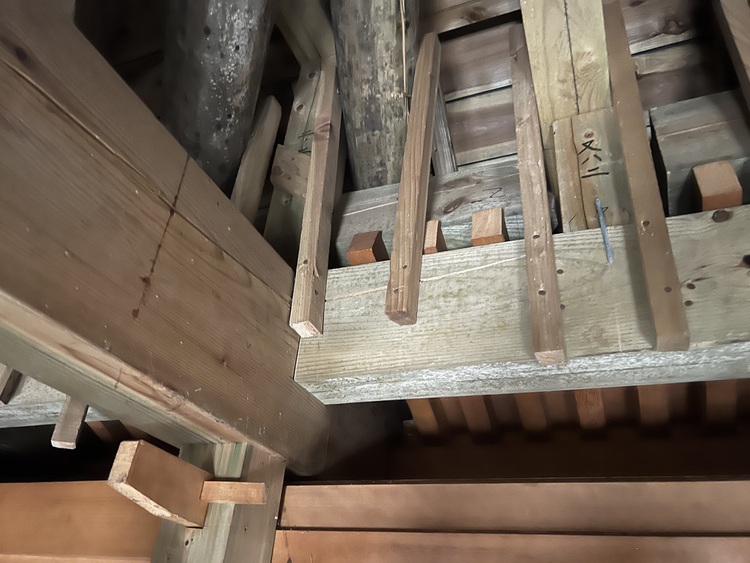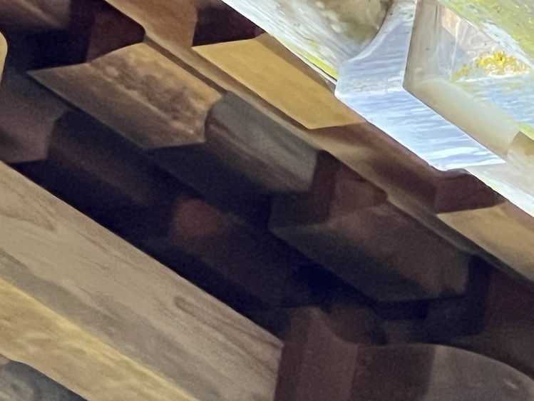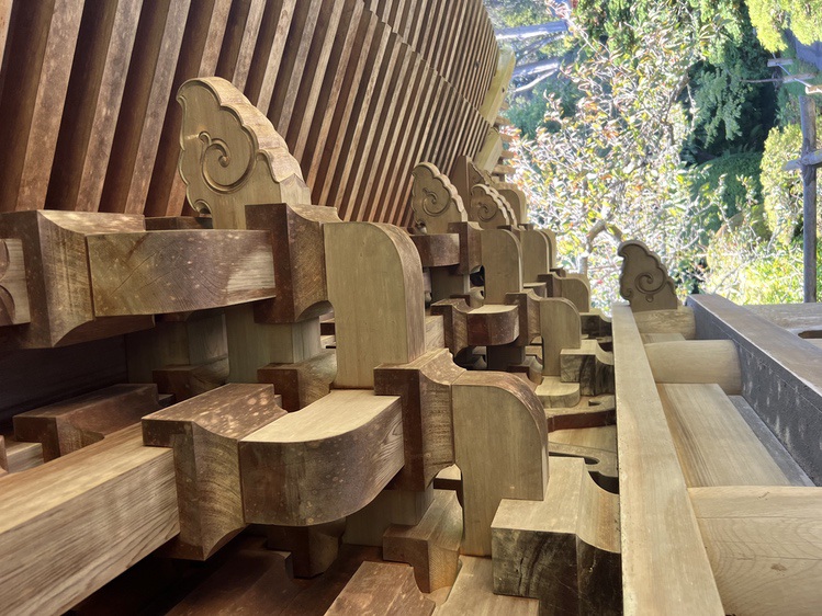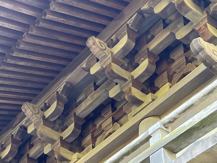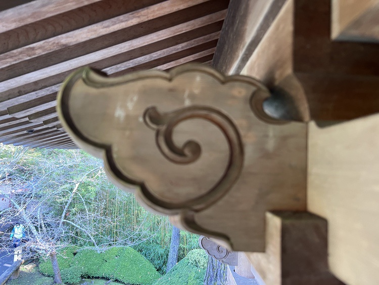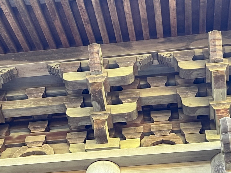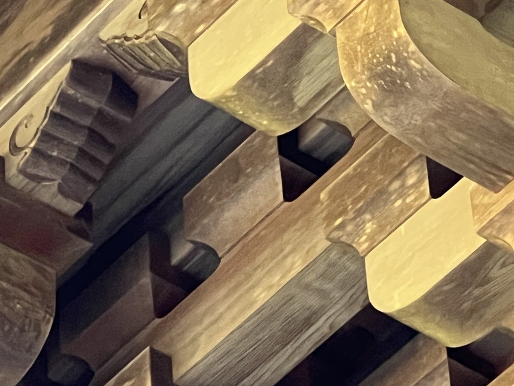But there are challenges: the roof brackets are ~25 feet overhead; the Hinoki has darkened with age; the roof casts a deep shadow over the joinery. In short, they are difficult to see.