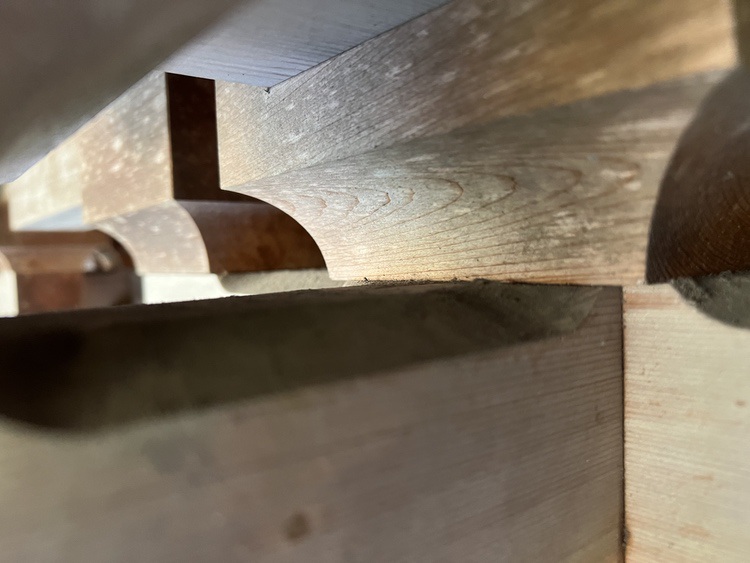 The joinery consists of lap joints, cogged lap joints, dovetails, and slip tenons. The Gate’s brackets have a notable simplification over Pan Dehua’s drawings: the arms parallel to the wall plane and the cantilevered elements perpendicular to the wall plane are all the same height. This greatly simplified construction of the lap joint housing. It also meant that I didn’t need to relieve and profile material to bring the bearing blocks for the next tier into plane. I was not sorry about this!