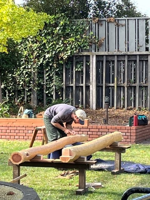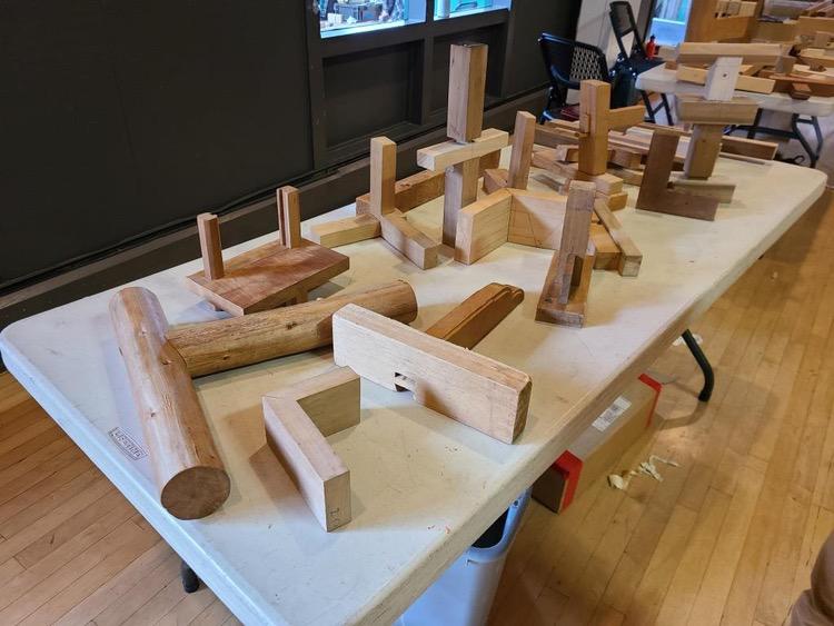 Other attendees were working on the process of notching large cross beams, pausing now and then to go sharpen a blade.