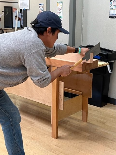 A village was springing up and woodworkers’ shops unfolded into fascinating, engaging displays of craft. The entire 6000 foot space, both outdoors and inside the main hall, had displays, timber framing stations, and ten planing stations. These were efficiently assembled by the Kez Colorado contingent with help from Laney College woodworking students. Long before the morning program was scheduled to start, all the rooms were completely set up with chairs, tables, charts, and displays.