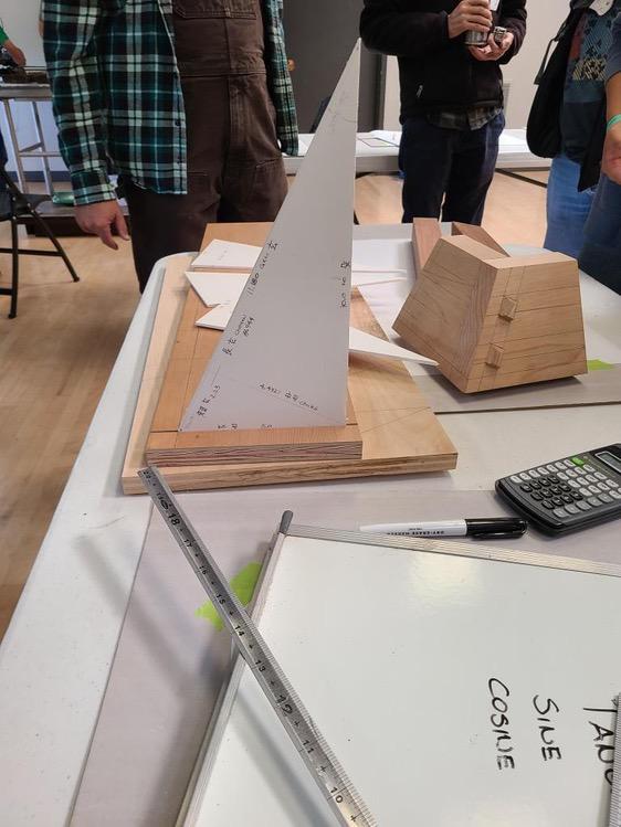 Our resident stone sleuth, Alex Gilmore, unveiled many “old-new” natural polishing stones at his professional polishing station, where he lectured and demonstrated the best methods to sharpen knives. He shared space with a quiet class by master carpenter David Bassing, who demonstrated use of the sashigana ( Japanese framing squares) to map out roof hips and rainbow rafter curves. This class introduced many students to the rules, steps and tricks of using this essential layout tool.