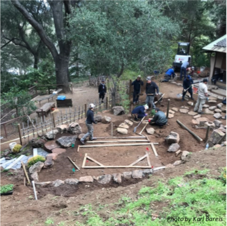 Recently Kez volunteers had built a small wisteria arbor near the gift shop, so our extension into supporting the formal tea garden was something that garnered support from our membership. Within the formal tea garden there’s a space for a small covered waiting area (machiai), and that’s the part of the project we’d been inspired to help with. The design process took several years and eventually involved a group of Japanese traditional landscapers who helped with the design and volunteered their time to travel to Saratoga to implement their design. In January we put out the word that the team from Japan would need our help to be able to get the project installed. Our job was to work with Hakone Foundation and the tea schools to come up with a well proportioned machiai design that could be eventually be built by our group.