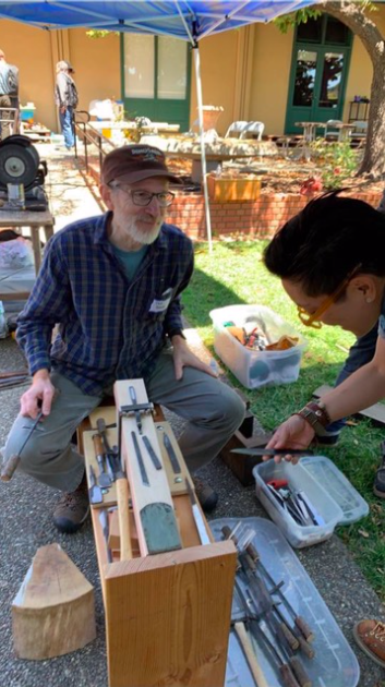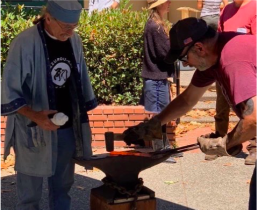 We have many people to thank for this opportunity. Especially to note Blacksmith John Burt’s contributions. John’s wealth of smithing and demonstration experience made him the perfect interpreter/translator for folks watching. Many of the tools used were ones he brought from home (anvils, hammers, vises, etc). We couldn’t have done it without him. Jay Van Arsdale, with his indomitable spirit of welcome, got them thinking of the possibility. With Jay’s help the California Blacksmiths Association (CBA) came together on short notice to loan us forges and other valuable logistical support. And of course Suzuki-ya, for thinking up the idea of having high quality American-made hand tools at the event. We want to thank the three blacksmiths who brought us the unique opportunity to see a forge in action and allow many of our members to actually get some experience handling the red-hot steel. Finally to Jim Blauvelt who shared his story.